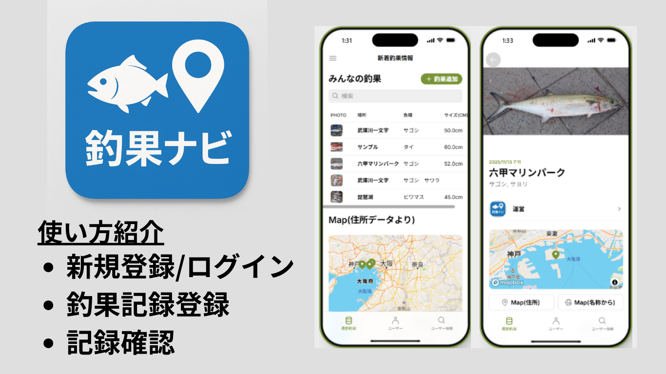 このページでは、釣果管理アプリ”釣果ナビ”のユーザー登録・釣果記録登録・釣果記録確認の方法について紹介しています。